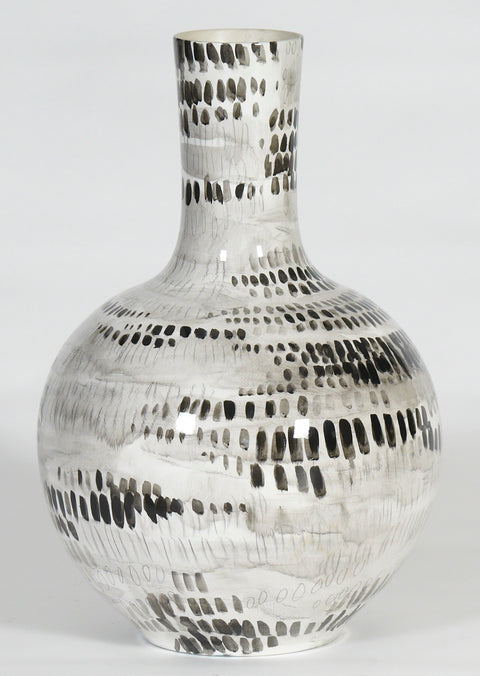 An interesting and playful design mimicking binary code is applied to this classic long neck vase in shades of black, grey and white. Available in one size only.