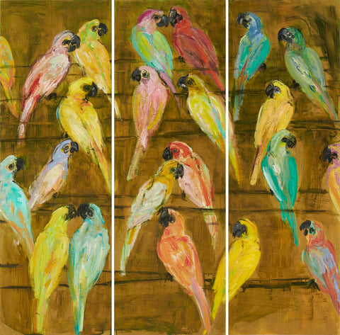 Colourful and whimsical, these three wall panels are hand painted to reveal vibrant and busy parrots in a multitude of colours